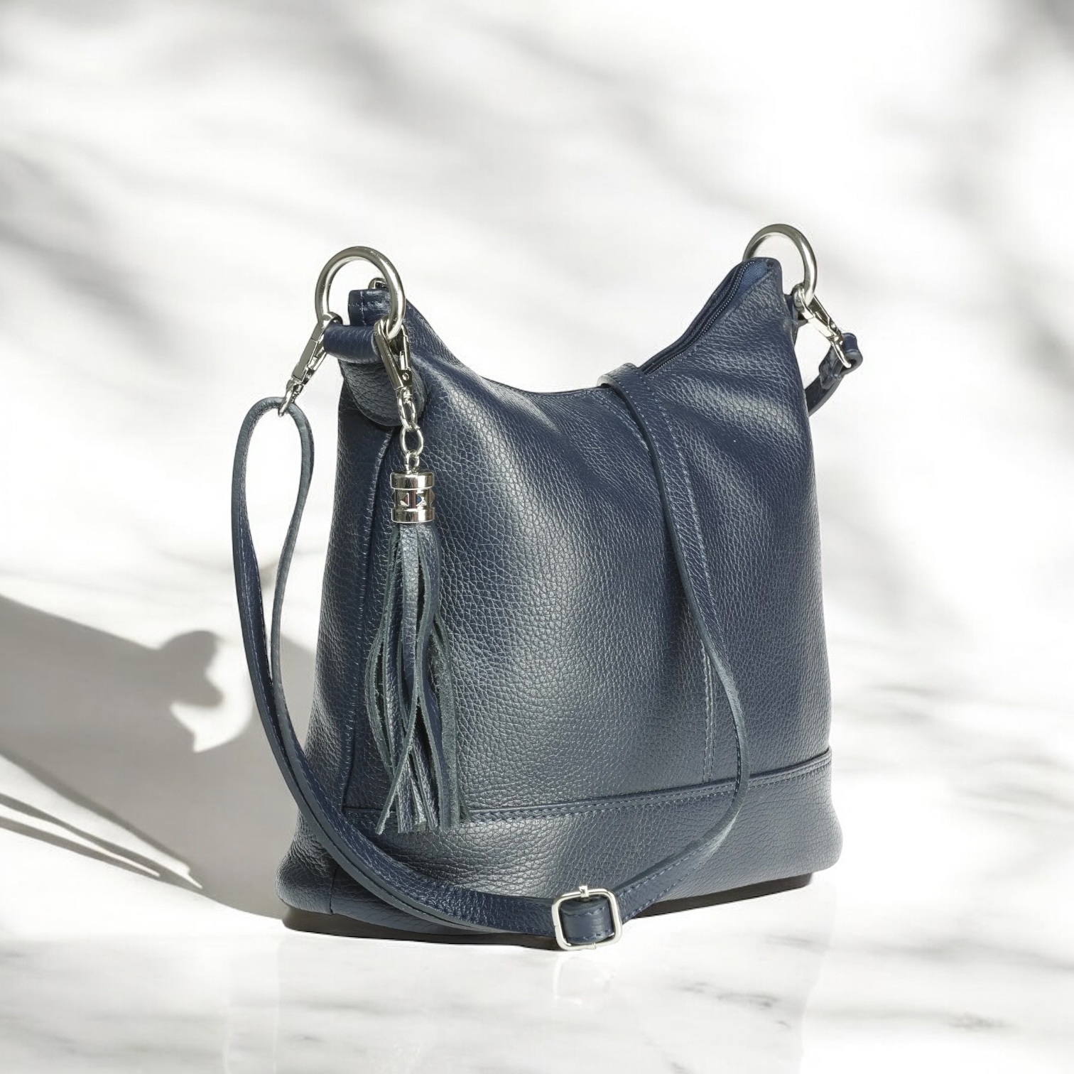 £49.00 Add to basketNavy Italian leather bucket bag with tassel