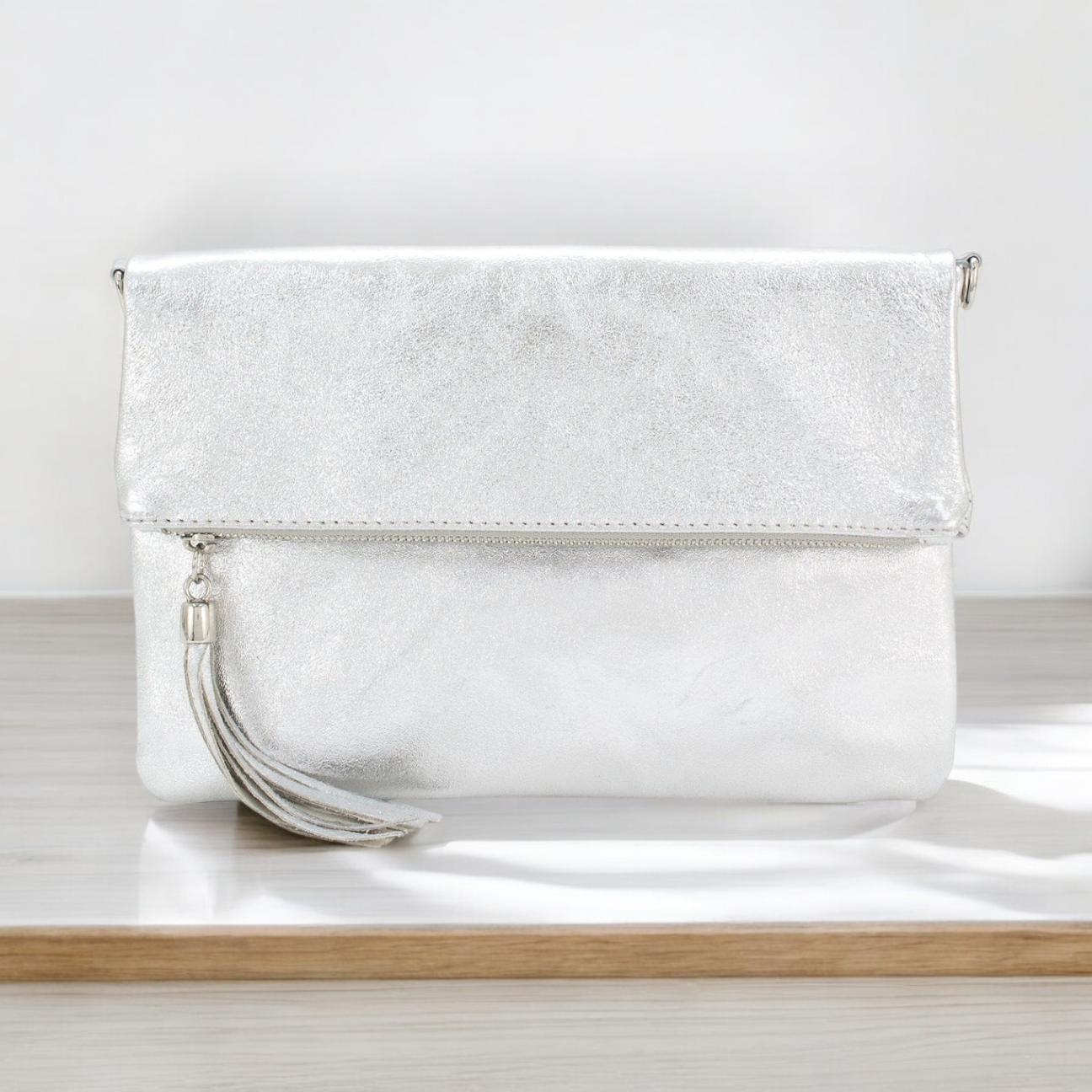 £39.00 Add to basketSilver Foldover Leather Clutch with long strap