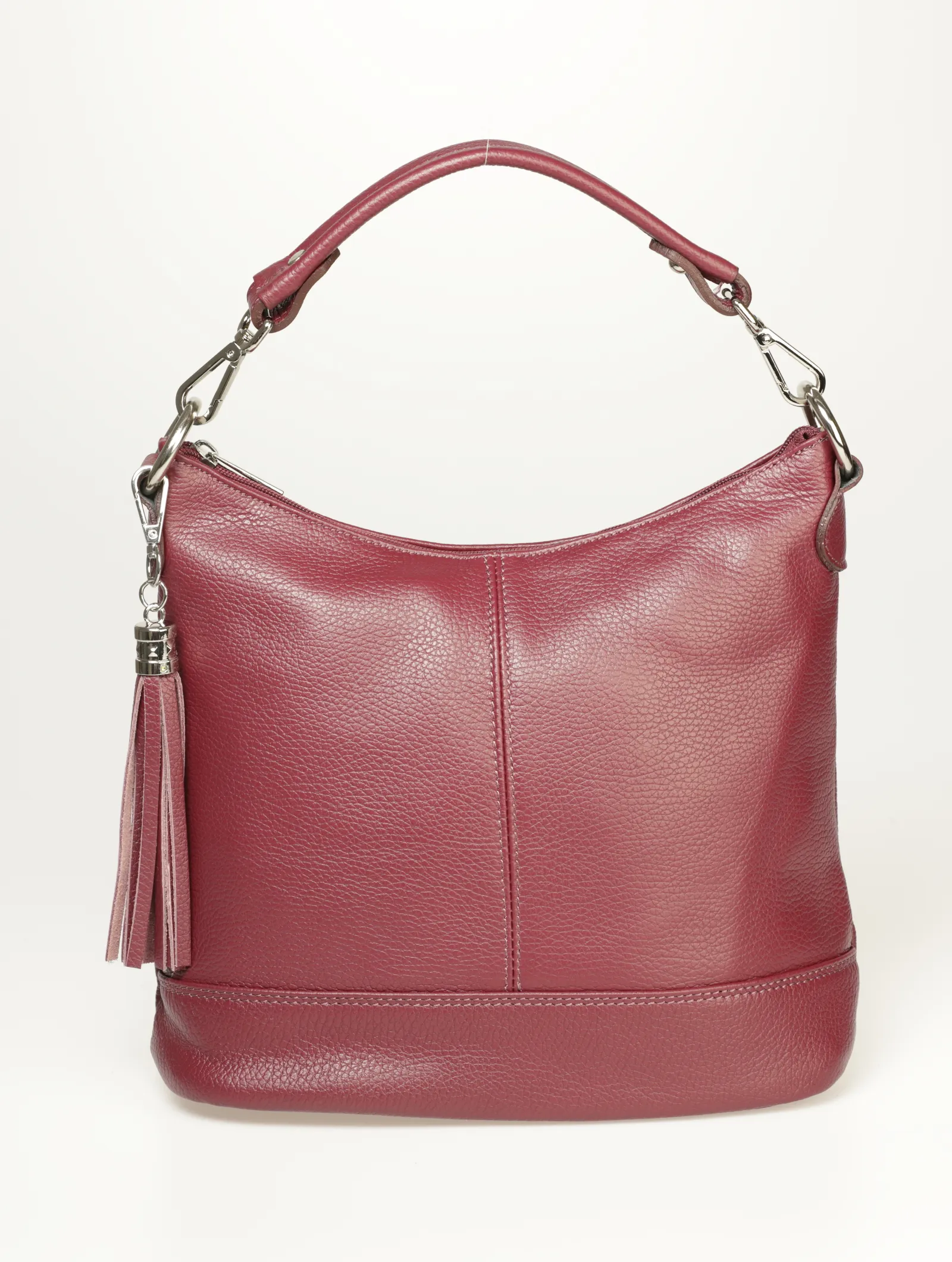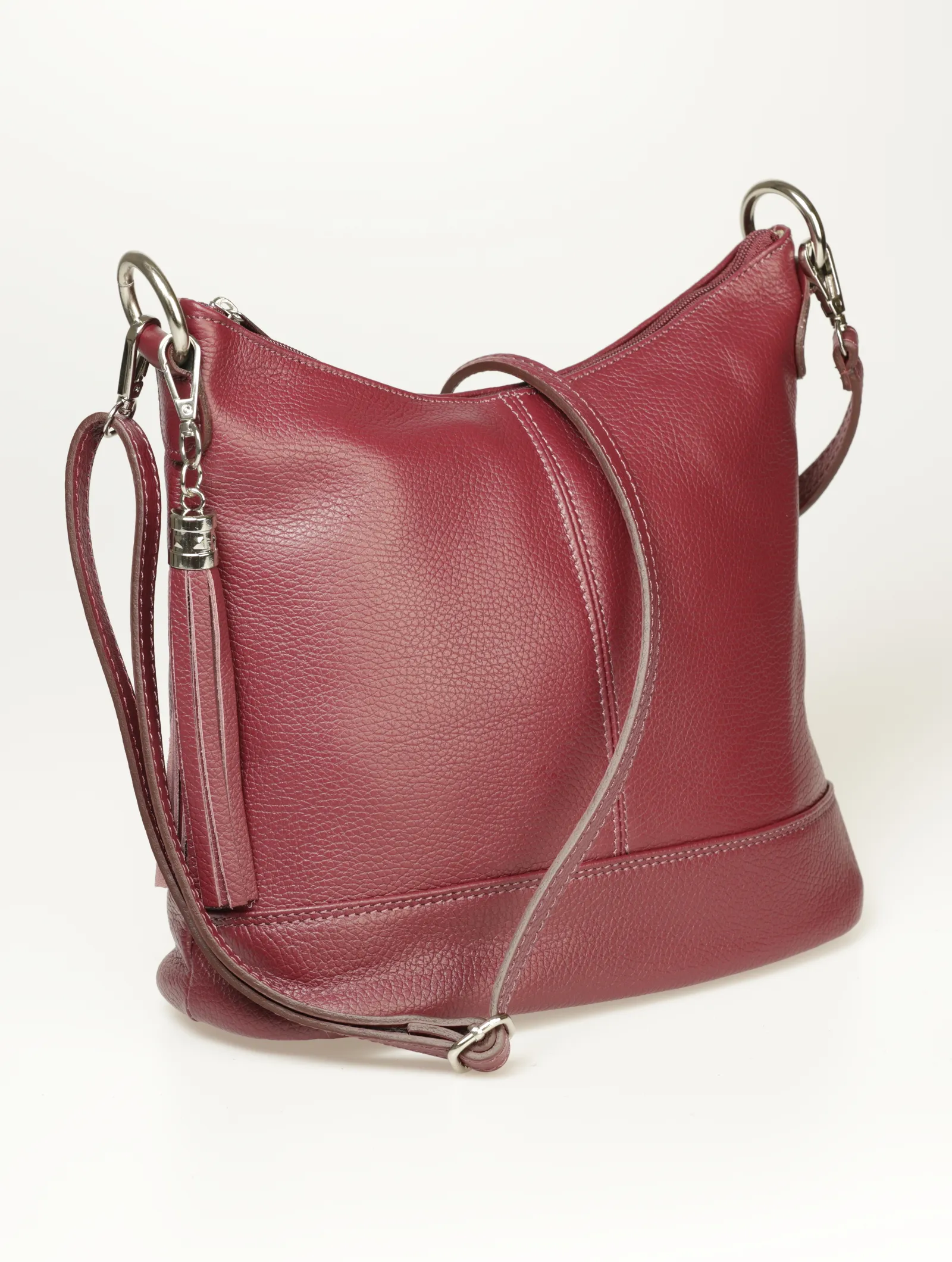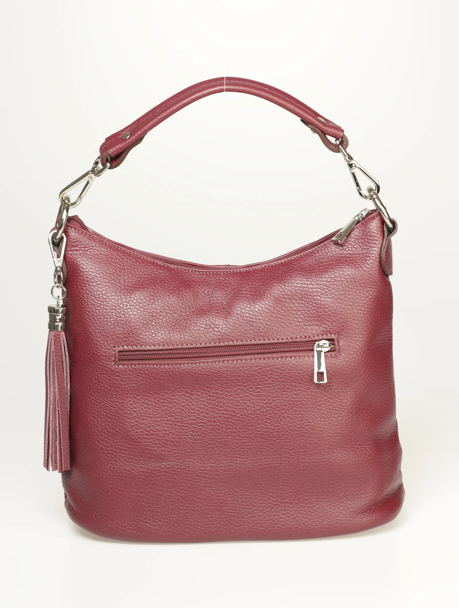 Soft Italian leather shoulder bag with a single compartment inside, zip closure at the top, inside zip pocket, outside pocket, polyester lining and leather removable shoulder strap.