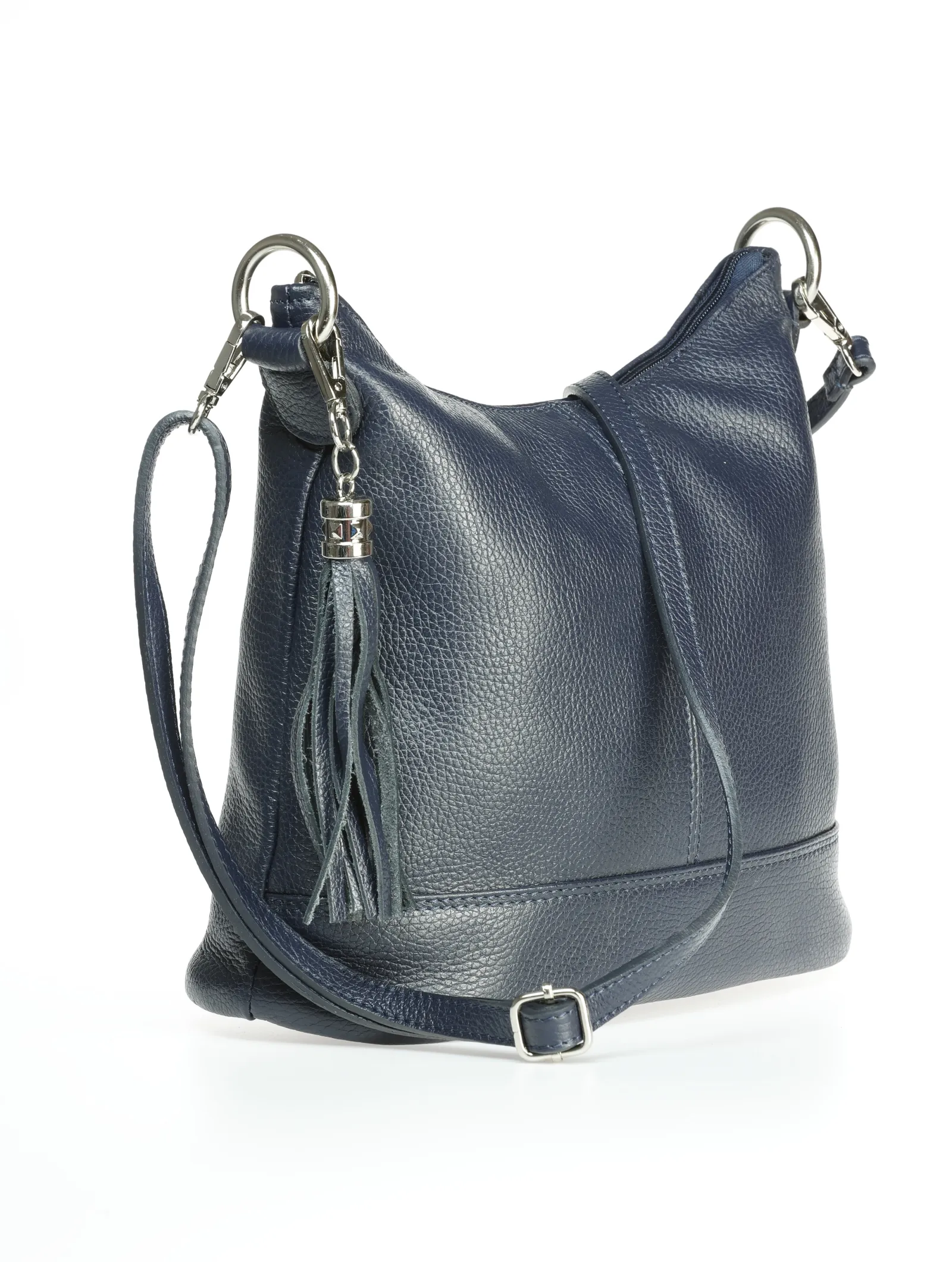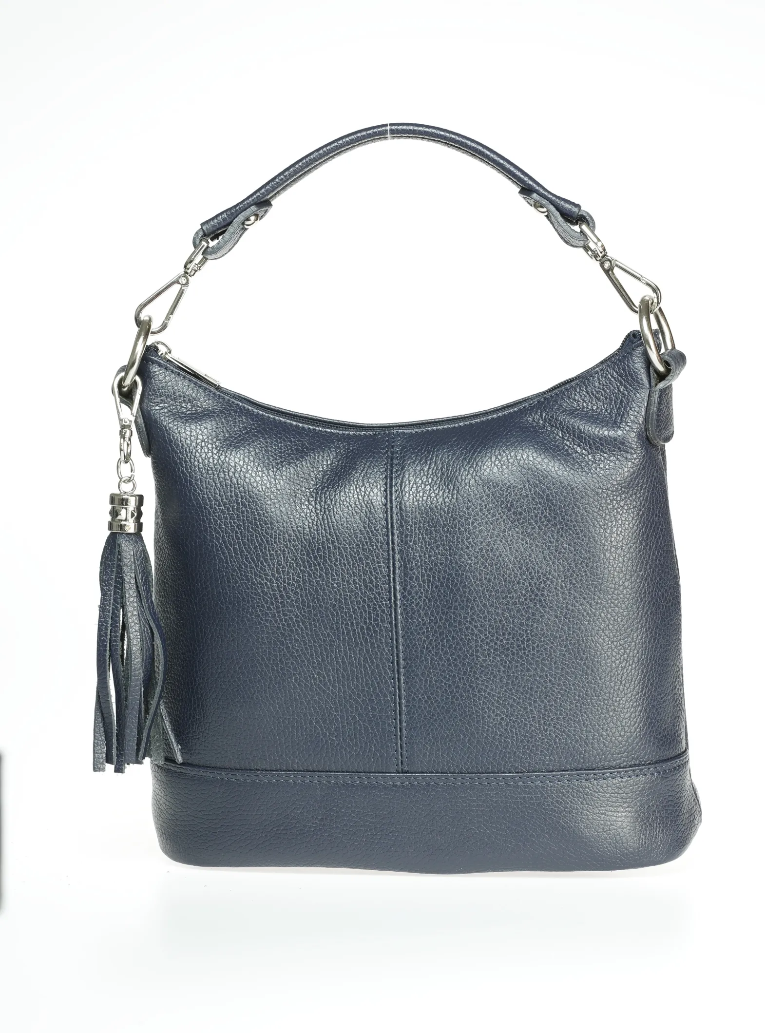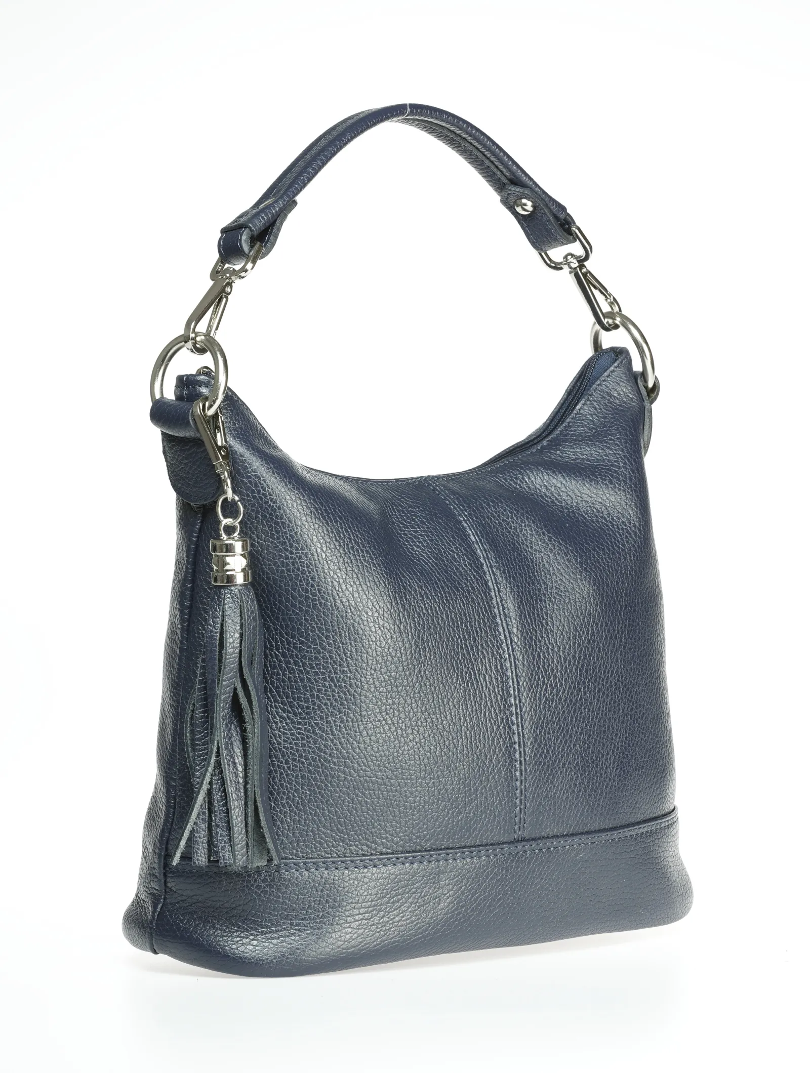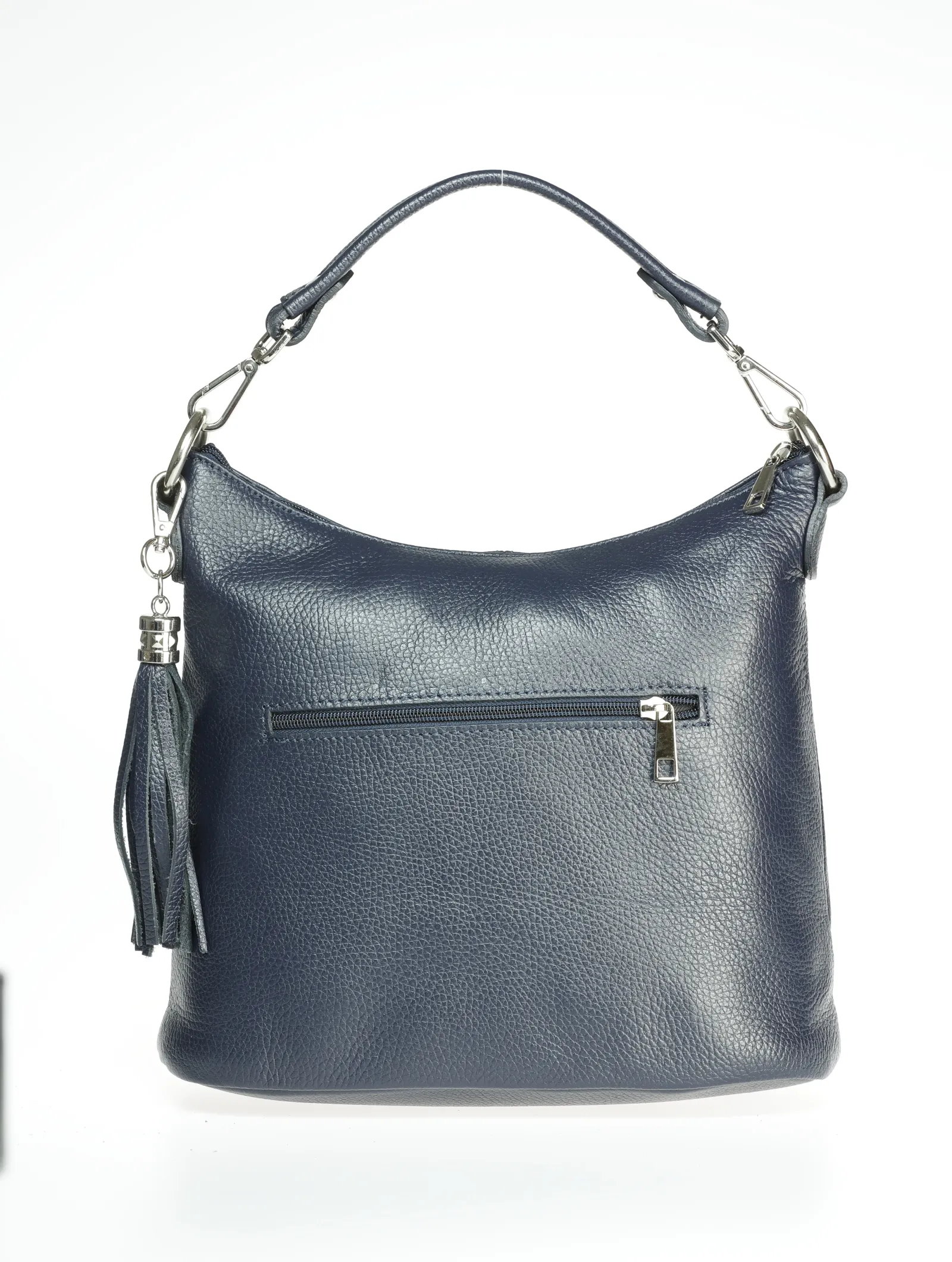 Soft Italian leather shoulder bag with a single compartment inside, zip closure at the top, inside zip pocket, outside pocket, polyester lining and leather removable shoulder strap.