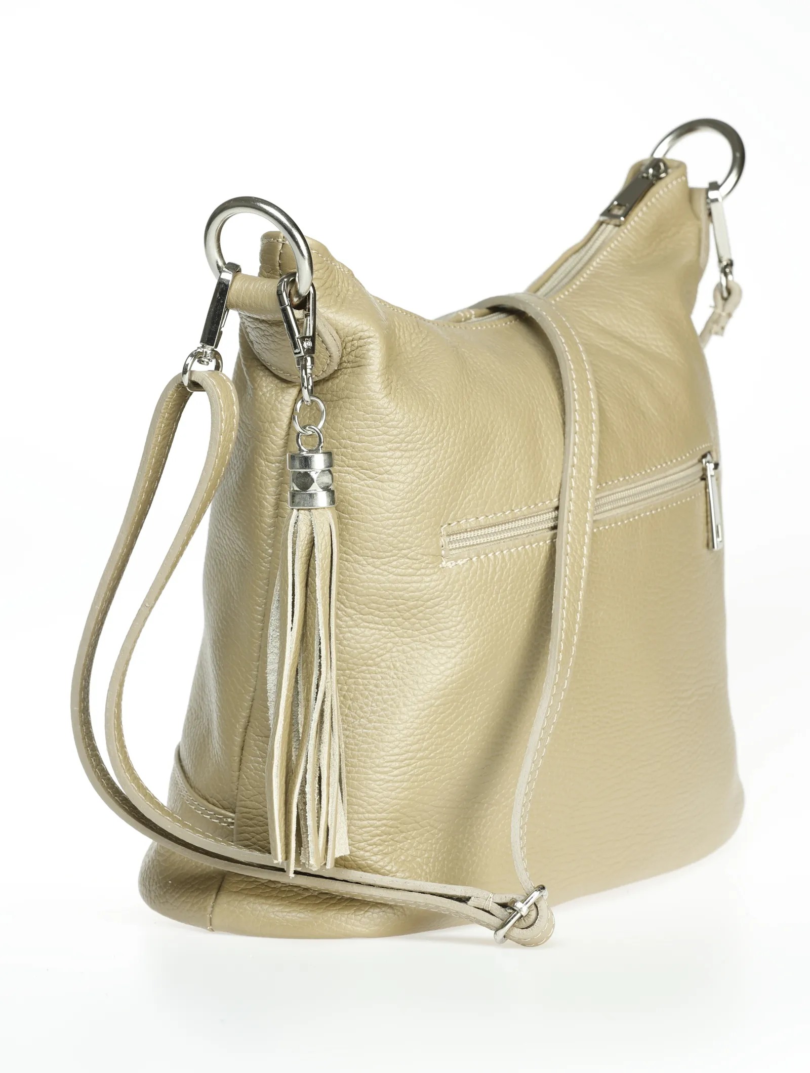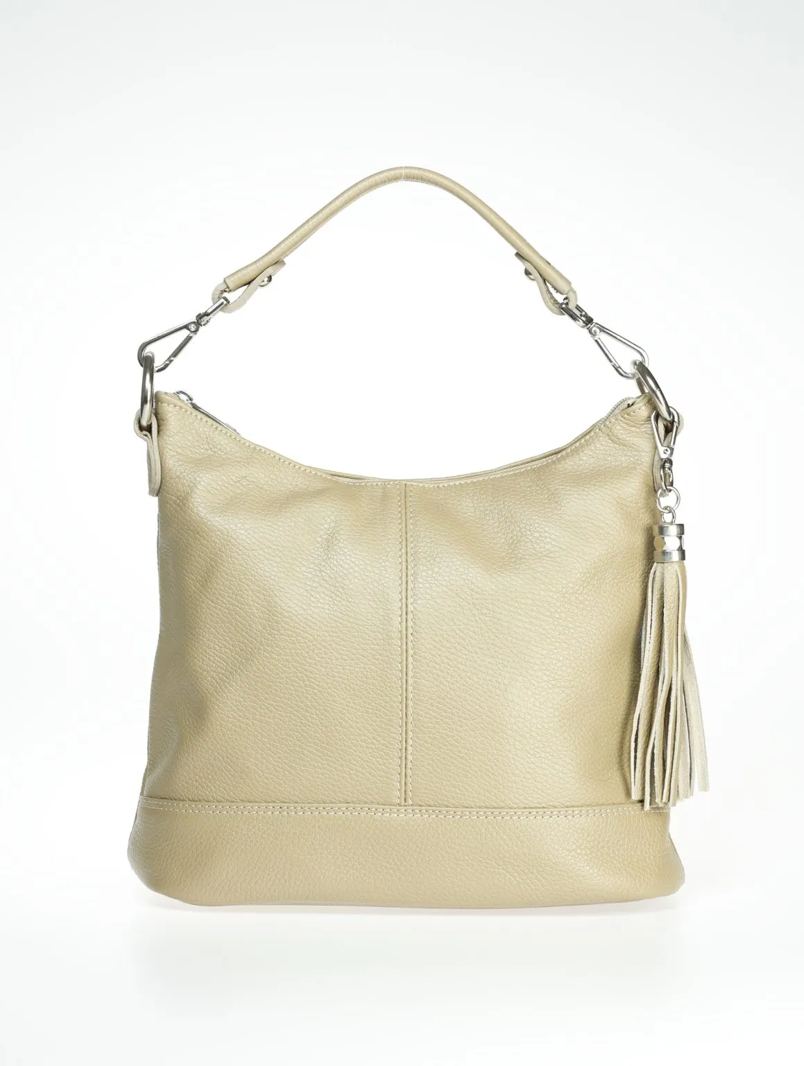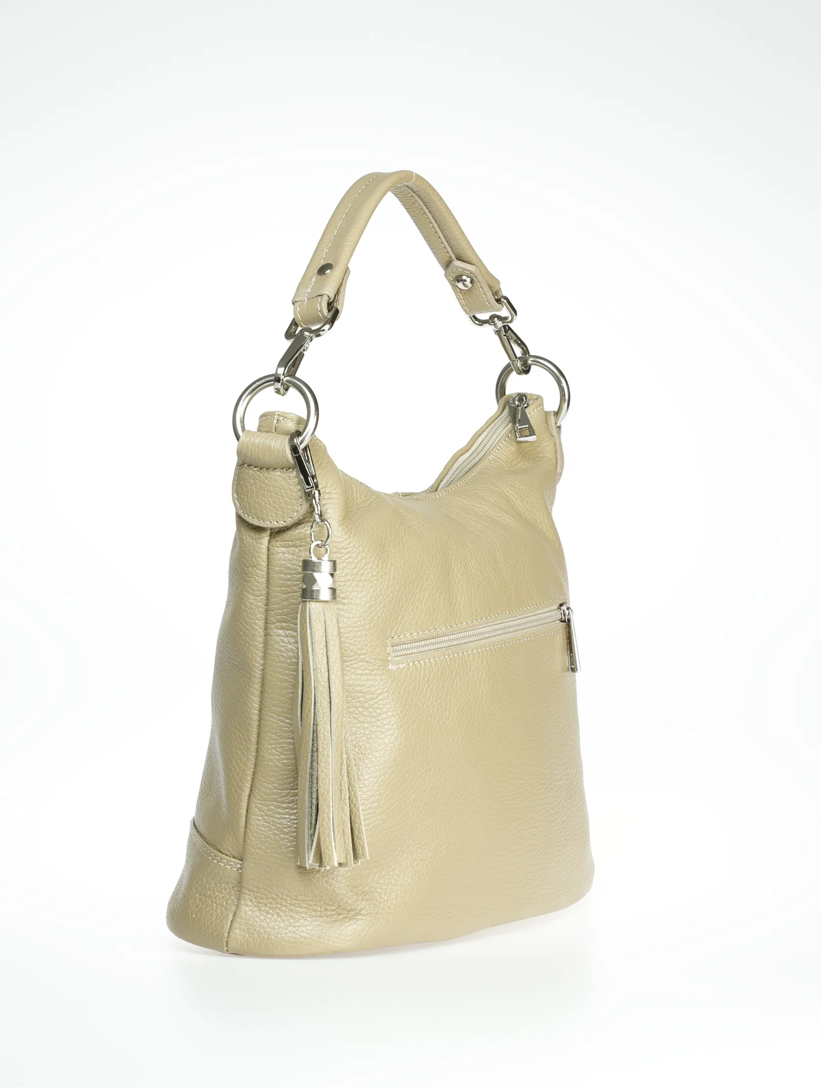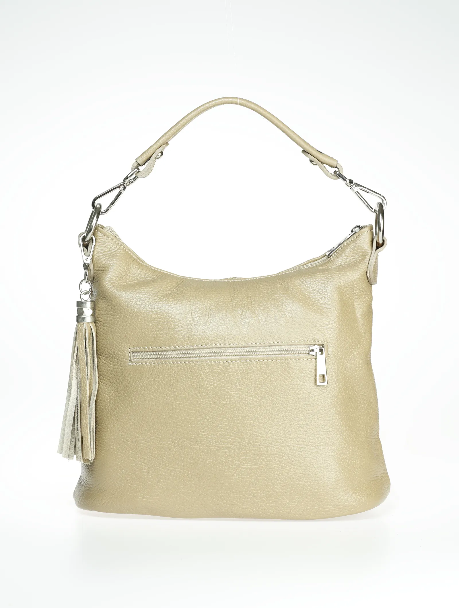 Soft Italian leather shoulder bag with a single compartment inside, zip closure at the top, inside zip pocket, outside pocket, polyester lining and leather removable shoulder strap.