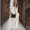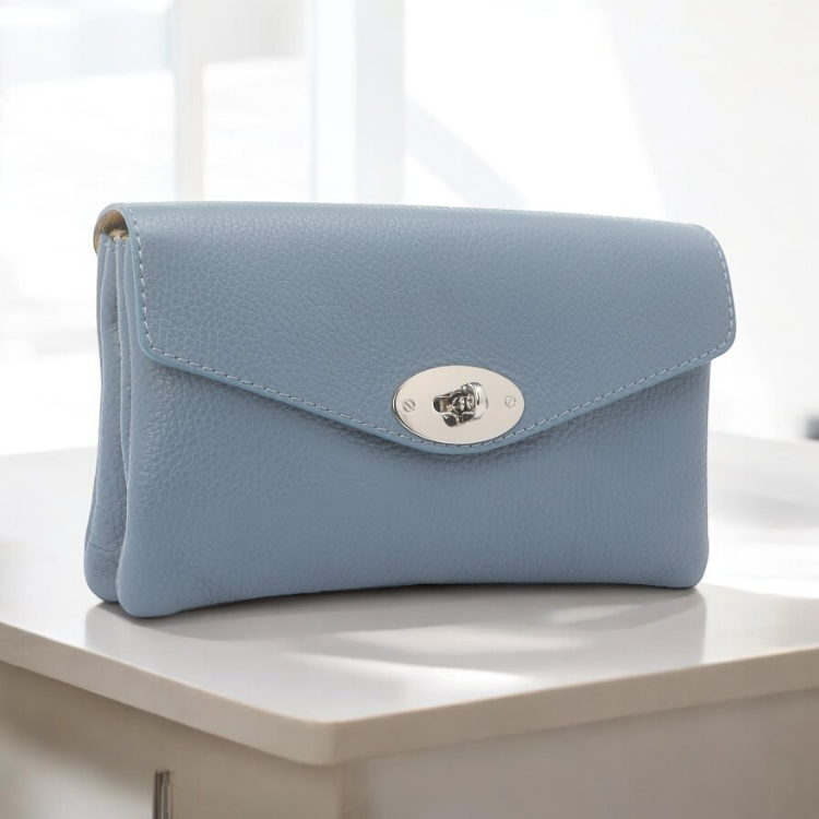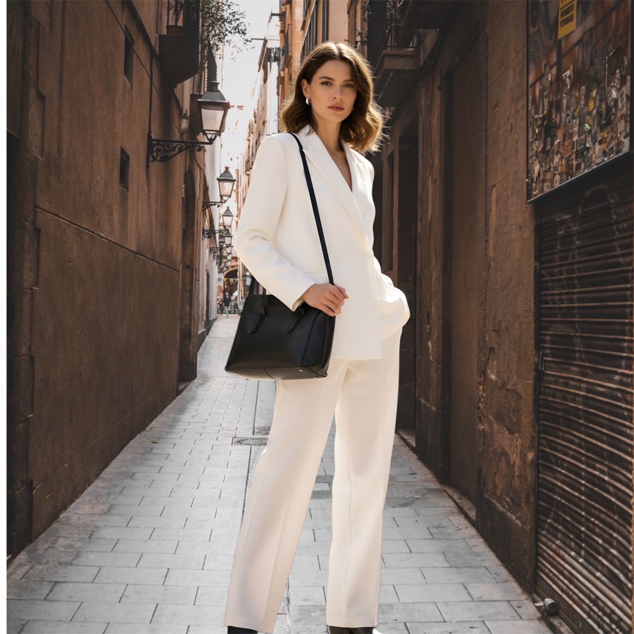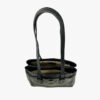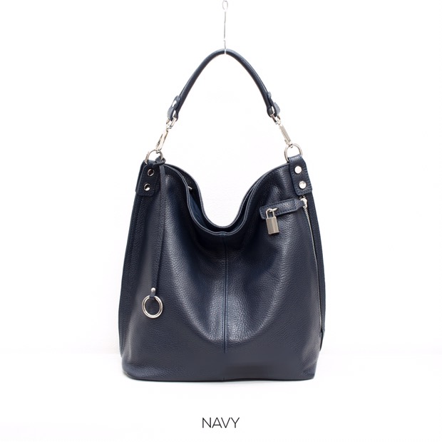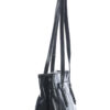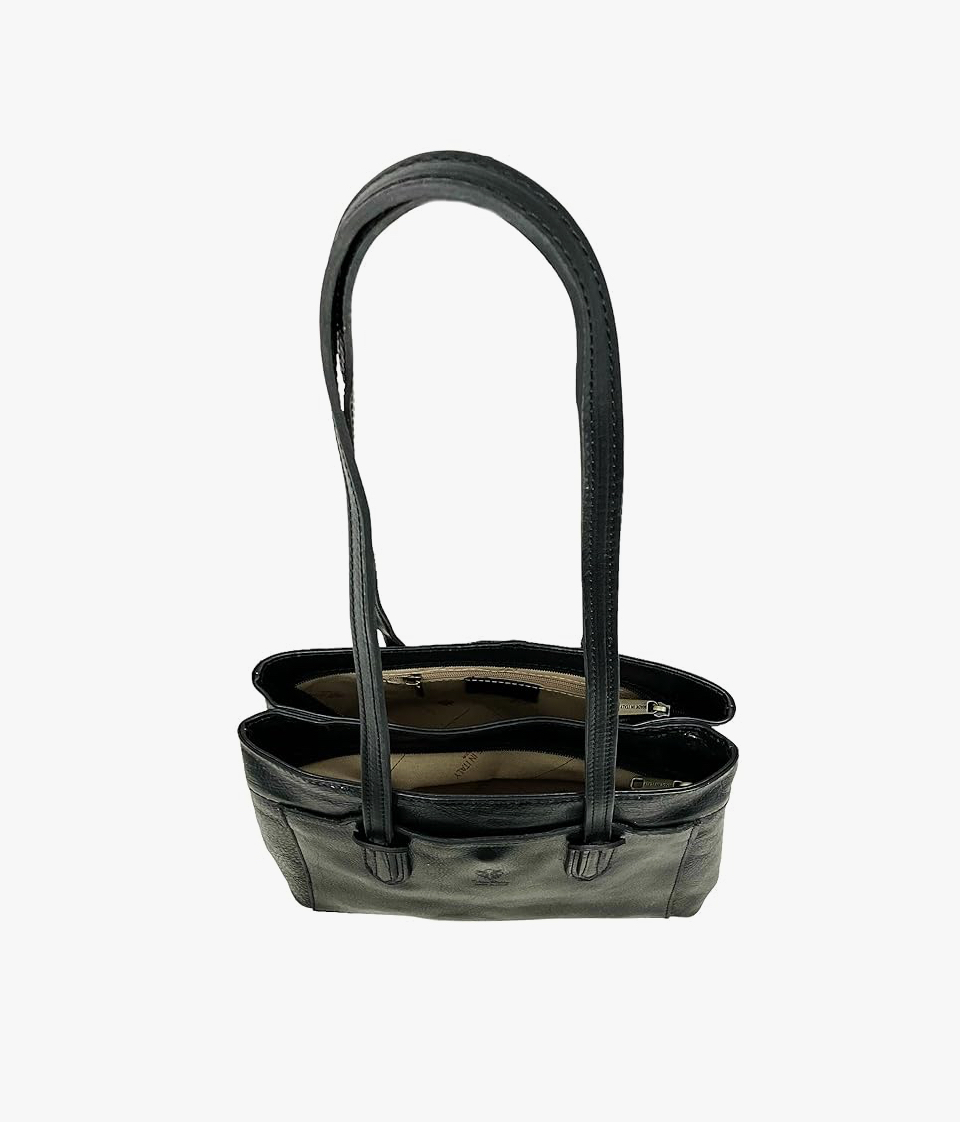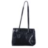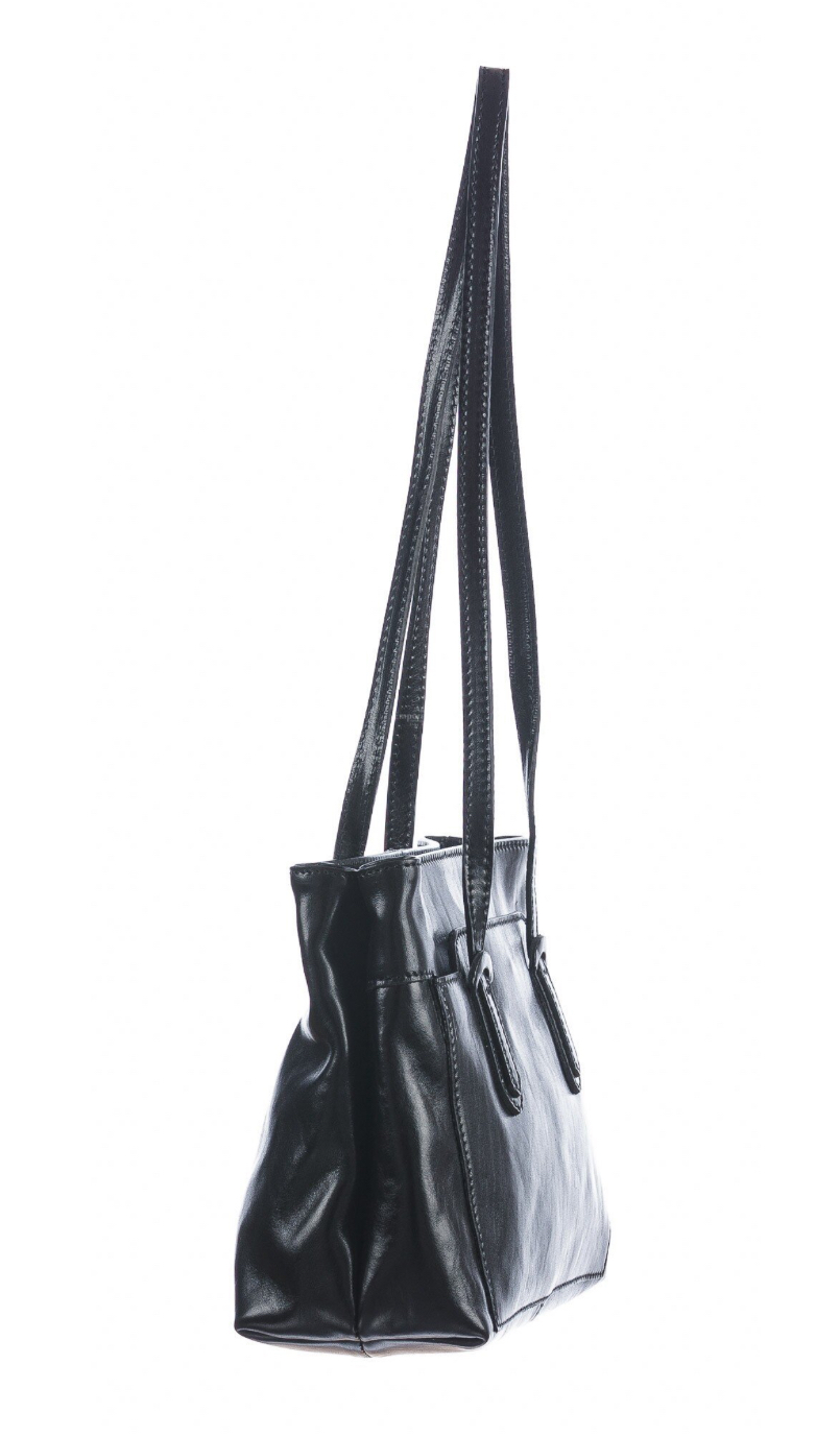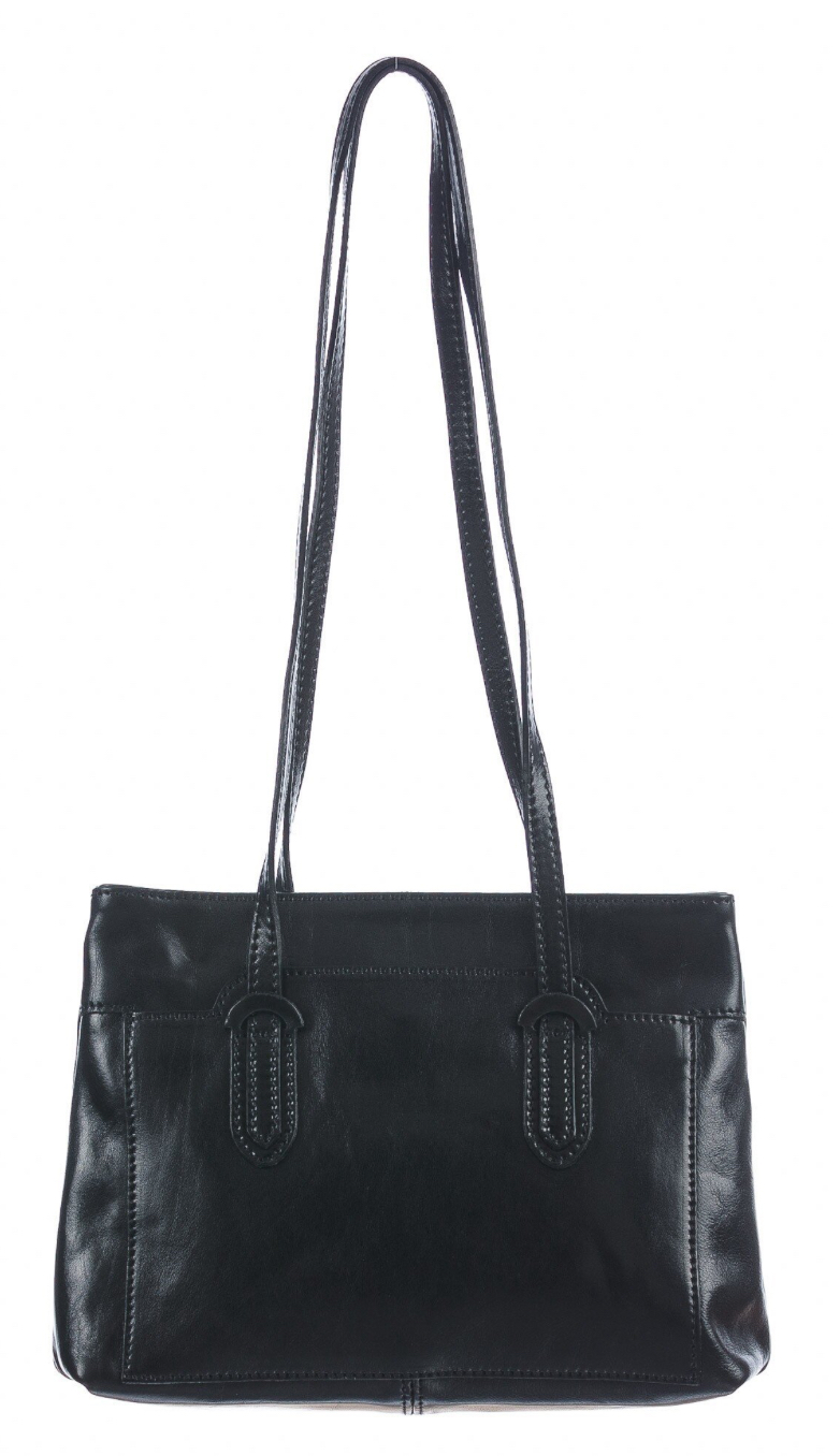 This ladies leather shoulder bag with long handles features two convenient zip compartments and an external snap pocket. This elegant, roomy, and convenient model features double handles. Available in black.
